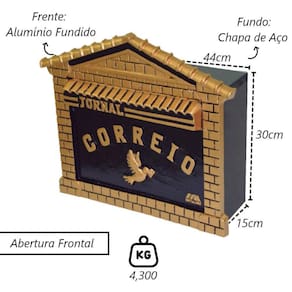 Caixa Correio Para Cartas Jornal Castelo Detras 15x44x30cm A caixa de correio é usada para receber correspondências como cartas, contas e revistas, sendo colocada em frente a residências e empresas para garantir a entrega segura das correspondências. Sua função principal é oferecer um local seguro e conveniente para receber correspondências, protegendo-as do clima e de acesso não autorizado. Existem diversos tipos de caixas de correio, desde as individuais até as maiores para prédios, facilitando a distribuição das correspondências aos destinatários. Indicação de Uso: A caixa de correio é usada em residências, apartamentos, estabelecimentos comerciais, escritórios e instituições públicas para receber correspondências como cartas, pacotes e documentos. Ela serve como um local seguro e conveniente para coletar e armazenar temporariamente essas correspondências até que sejam retiradas pelo destinatário. Especificações Técnicas:Material Frente: Alumínio Fundido.Material Fundo: Chapa de Aço.Importante: Não entra água.Abertura por Detrás.Cor: Dourado. Medidas:Largura: 44cm.Peso: 4,300Kg.Altura: 30cm.Fundo: 15cm. Itens Inclusos:01 Caixa Correio Para Cartas Jornal Castelo Detras 15x44x30cm. Código: 514MTMProdutoLojaPlast. Marca: Metal Mig