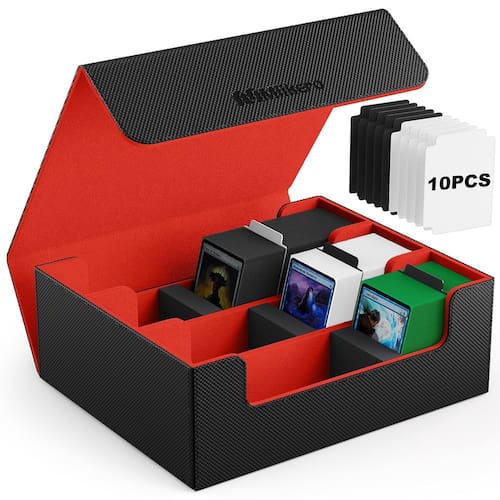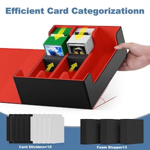 Mlikero Estojo para cartas, caixa de armazenamento de mais de 1800 cartões colecionáveis com 10 divisórias e 3 tampas de espuma, caixa de baralho Commander com fecho magnético de couro, adequada para - ?Organização eficiente de cartões?A caixa de armazenamento de cartões colecionáveis vem com 10 divisórias de cartão e 3 tampas de espuma, ajudando você a organizar seus cartões perfeitamente. O design robusto de fecho magnético garante que a caixa do baralho permaneça firmemente fechada, mesmo quando virada, garantindo a segurança de seus cartões sem nenhum dano. - ?Grande capacidade?Medindo 29 x 25 x 10,7 cm, a caixa de cartão acomoda facilmente mais de 1800 cartões com capa, mais de 1100 cartões de manga dupla e mais de 2400 cartões sem manga, atendendo a todas as suas necessidades de armazenamento de cartões. - ?Durabilidade superior?Feita de materiais de alta qualidade, nossa caixa de baralho TCG possui um exterior à prova d'água e um forro de microfibra macio, oferecendo proteção abrangente para seus cartões contra arranhões, vincos e outros danos. O material externo resistente e durável melhora a sensação tátil e a aparência elegante da caixa de cartões colecionáveis, garantindo proteção perfeita para todos os seus cartões. - ?Caixa de armazenamento de cartões versátil?Habilmente projetada para jogadores de cartas, nossa caixa de armazenamento de cartões é adequada para uma ampla variedade de cartões colecionáveis. É compatível com MTG, PKM, TCG, bem como cartões de futebol e beisebol, mantendo sua coleção organizada e aprimorando sua experiência de jogo - ?Presente perfeito para colecionadores de cartões? Lutando para manter seus cartões organizados? Esta caixa de baralho Commander é a melhor solução, mantendo sua coleção limpa enquanto faz um presente atencioso para amigos e familiares que amam colecionar e jogar. - ?Observação?Não é adequado para protetores de cartão de plástico rígido e suporte de cartão magnético.
