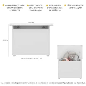 O Baú Organizador Caixa de Brinquedos Multimóveis é produzido em MDP com acabamento acetinado (cerca de 20% de brilho), que garante maior durabilidade, resistência e facilidade na limpeza. Com amplo espaço interno para organizar brinquedos ou outros pertences, ele suporta até 15kg e, para maior segurança, o articulador da tampa possui trava, para evitar acidentes. O design clean, com linhas retas, torna o móvel muito versátil, permitindo que seja utilizado em qualquer cômodo da casa e até mesmo de escritório.