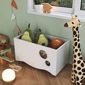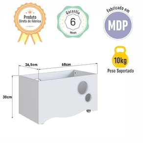 A Caixa de Brinquedos com Rodízios Linha Encanto da Completa Móveis é versátil, prática e elegante, com características que a destacam. Ideal para o quarto do seu bebê, podendo guardar e organizar aqueles brinquedinhos que ficam espalhados pelo quarto! Possui dois rodízios com trava e dois rodízios sem trava, podendo assim tanto movimentá-la quanto deixá-la travada caso necessário. Um produto realmente muito prático! Lembrando de que o produto é entregue desmontado. Acabamento: Finish Foil Ambiente Principal: Quarto Infantil Complexidade da Montagem: Baixa: pode ser montado por uma pessoa sozinha Cor: Branco Cor do Produto: Branco Escala de Brilho: Fosco Itens Inclusos: 1 Caixa de Brinquedo, 1 kit Ferragem + Manual de Montagem Linha ou Coleção: Encanto Manual de Montagem e Instalação: https://product-hub-prd.madeiramadeira.com.br/975278/documents/fe17a10f-e761-48db-83b7-542da2ac7b642643599522917375419255663.pdf Marca: Completa Móveis Material do Fundo: MDP Material Principal: MDP Necessita Montagem: Sim Origem do Produto: Nacional Peso: 9,7 kg Possui Espelho: Não Possui Possui Fundo: Sim Possui Portas: Não Possui Prateleiras: Não Possui Toalheiro: Não Recomendações de Uso, Manutenção e Limpeza: Use um pano levemente umedecido com água, seguido de pano seco. Não utilize produtos químicos ou abrasivos. Sistema de Montagem: Sistema de montagem via parafusos, cavilhas e sistema minifix. Suporta Até (kg): 10 kg Tipo de Nicho: Livreiro