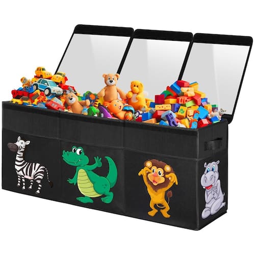 Caixa de brinquedo extragrande de 155 L para meninos, caixas de armazenamento resistentes dobráveis com tampas, grande caixa de brinquedos organizadora de armazenamento para crianças, meninas, quarto de bebê, sala de jogos, armário, 106 x 30,6 cm. Idade apropriada a partir de 3 anos. (Caixa de armazenamento dobrável fácil de instalar) O divisor do meio da caixa de armazenamento removível é conveniente para armazenar brinquedos de diferentes tamanhos, ou se tornará um organizador maior para itens maiores. A tampa organizadora removível e transparente, alça resistente e design de adesivo removível são fáceis de abrir e fechar. Use a caixa de brinquedos com alça de transporte para facilitar a mobilidade em casa. (Organizador de baú de brinquedo de capacidade extra grande com tampa) o tamanho desdobrável é de 106 x 35 cm, que é grande o suficiente para guardar vários tipos de brinquedos e bonecas. Especialmente adequado para famílias com muitos tipos de brinquedos infantis. Não se preocupe com crianças tropeçando em brinquedos bagunçados. Idade adequada para crianças acima de 3 anos. Aviso: use esta caixa de armazenamento sob supervisão de um adulto. Contém uma alça, estas são peças pequenas para crianças. - Caixa de brinquedos extra grande de 155 L, organizador de 3 compartimentos: o tamanho não dobrável é 106 x 35 cm, grande o suficiente para guardar vários tipos de livros, revistas, cesta de toalhas de roupas, cobertores. Especialmente adequado para famílias com muitos tipos de brinquedos e bonecas - 5 bolsos laterais de malha elástica com estampa de animal Design patenteado: 5 bolsos laterais na caixa facilitam a organização de uma variedade de cartões infantis e peças pequenas. Esta caixa de brinquedos é ideal para sala de estar, quarto, banheiros, despensa, quarto de criança, quarto de bebê - 3 tampas transparentes exclusivas da mais alta qualidade da YOHOOLYO: Torne a caixa de brinquedos mais fácil para as crianças encontrarem brinquedos. O design exclusivo de tampas transparentes resistentes pode aumentar a frequência de crianças usando brinquedos e cartões educativos, tendo um melhor efeito educacional - Caixa de brinquedos Oxford 600 D: o organizador de brinquedos é feito de tecido oxford 600 D resistente ao desgaste e placa de plástico, em vez de tecido e papelão quebrados facilmente. Não se preocupe com crianças tropeçando em brinquedos bagunçados. Cultive os hábitos de armazenamento das crianças desde tenra idade - Caixa com 2 divisórias ajustáveis dobráveis para mais opções de espaço: as divisórias ajustáveis dentro do organizador são convenientes para você escolher diferentes tamanhos de espaço para atender a diferentes tamanhos de armazenamento de brinquedos e também podem ser retiradas - Caixa de brinquedos YOHOOLYO fácil de transportar e mover: graças às alças macias nas laterais. Pode ser guardada na sala de jogos, armário, canto ou ao lado do sofá. Manter o quarto limpo e organizado ajuda as crianças a desenvolver um bom senso de organização e hábitos - Design removível das 3 tampas perfeitas para armazenamento de brinquedos, livros, revistas, roupas, cesta de toalhas, cobertores, decorações e outros suprimentos. O design mágico removível de gancho e laço é fácil de instalar e usar. Remova a película protetora da superfície antes de usar - 3 placas inferiores embutidas. Placa de plástico sólido de 3 mm sem odor de toda a caixa ajuda a evitar deformação após a carga. Resistente do que o normal, prolonga a vida útil do organizador. Caixa de brinquedos com alças e placa de plástico, fácil de mover pela sua casa