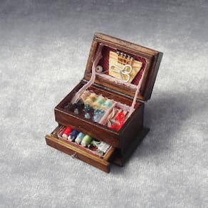 Caixa de costura de madeira em miniatura Dollhouse com bobinas de linha 1:12