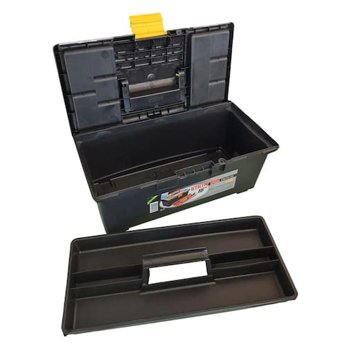 Caixa para ferramentas com organizador CF26 SÃO BERNARDO Descrição A UTILY BOX 16" com Organizador CF27 São Bernardo conta com design moderno e prático, facilitando a organização de diversos materiais, como ferramentas, materiais de costura, medicamentos, materiais de pintura, entre outro. Possui uma bandeja interna para melhor organização de pequenos objetos e um compartimento em sua parte inferior que proporciona muito mais espaço.