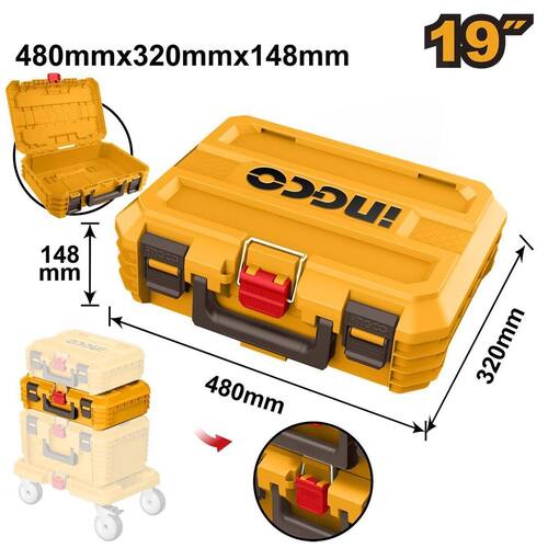 Caixa de ferramentas empilhável Ingco 19'. Produto ideal para otimização e organização das ferramentas, produto compatível para encaixe somente com as caixa de ferramenta Ingco modelos PBXS101 41cm e com a Base HHWB61001. Sem restrição de quantidade de caixas empilháveis desde que não ultrapasse 100kg total. Facilita transporte.