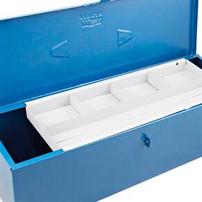 Caixa Báu com estojo removivél, pintura eletrostática, contém porta cadeado. Recebe tratamento Anti Ferrugem, dimensões: 50x16x15 cm (cxlxa).