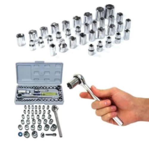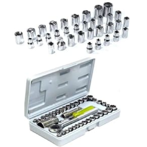 Jogo de Ferramentas com Maleta e Chaves Soquetes com com 40 Peças. - Excelente Jogo com de chaves com Varias Ótimo para Uso Domestico e pequenos reparos em casa ou em seus serviços como hobby. - Utilizados juntamente a alça de chave catraca reversível, os soquetes foram projetados para apertar e afrouxar parafusos de diferentes bitolas ou medidas. - Estes produtos não podem faltar na sua caixa de ferramenta para aqueles pequenos reparos ou hobbys. DPJ IMPORTS - Não recomendamos para , produto domestico e pequenos reparos. - As aberturas das bocas das chaves de aperto são verificadas com gabaritos calibrados, o que garante seu perfeito acoplamento nos parafusos. - Alguns tipos de chaves de aperto são fornecidos em bitolas métricas e em polegadas, para o uso nos diversos fixadores disponíveis, neste kit vocês tem as duas medidas. - As ferramentas são produzidas e testadas conforme normas específicas. - Material de alta resistência. Incluso no Pacote: - 1 Peça - 3/8Chave Reversível - 14 Peças - 1/4 Soquetes de Encaixe: 4, 4.5, 5, 5.5,6, 6.5, 7, 7.5, 8, 9,10, 11, 12, 13mm - 14 Peças - 1/4Soquetes de Encaixe: 5/32, 3/16, 7/32, 1/4, 9/32, 5/16, 11/32, 3/8, 13/32, 7/16, 15/32, 1/2, 17/32, 9/16 - 3 Peças - 1/4Soquetes de Encaixe BPT : 1/4, 5/16, 3/8 - 1 Peça - 3/8 Barra Extensora 3 - 1 Peça - 1/4 3/8 Adaptador - 1 Peça - 3/8 Vela de Ignição 21mm - 1 Peça - 6 Punho - 2 Peças - 3/8 Soquetes de Encaixe: 15mm 16mm - 1 Caixa de Plástico