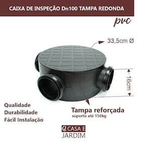 Indicado para: Caixa de Gordura, Caixa de Areia, Caixa de Inspeção e Caixa de Passagem Elétrica. Matéria prima: PVC; Cor: Preta; Diâmetros: 3 entradas DN 100 e 1 saída de 100mm juntas de dupla atuação ; Tampa Reforçada: Resistente a tráfego de pedestres suporta até 150kg de carga; Dimensões externas: 43x43x16h cm; Fundo em formato de canaleta com declividade; Temperatura máxima - 45C; Pressão Máxima: conduto livre/sem pressão.
