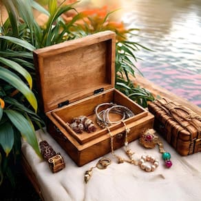 Adicione um toque de sofisticação à sua penteadeira com nossa caixa de joias de madeira lindamente trabalhada. Projetado com estilo e função em mente, esta peça requintada manterá suas preciosas joias seguras, organizadas e de fácil alcance.