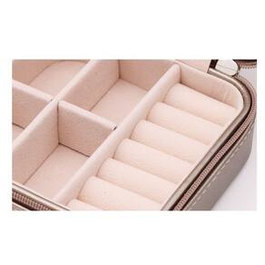 Caixa de joias de couro para viagens Esta linda caixa de joias é especial para levar suas joias mais queridas e inevitáveis em suas viagens. Com ele, você nunca perderá um anel ou um anel ao removê-lo e terá todos eles pedidos em um só lugar. Muito conveniente como presente ou presente para você! Tem lindas terminações e um fechamento muito bom.\ n\ nMedidas: 10* 10* 5 cm.
