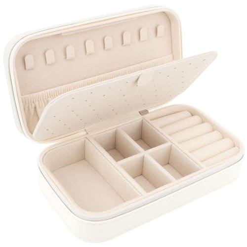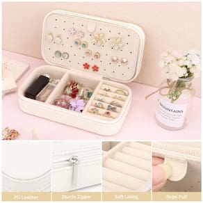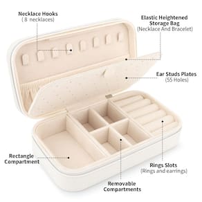 estojo de joias - 🎁?Caixa multifunção?O porta-joias de viagem tem 3 seções. A seção da tampa superior tem 8 ganchos e uma bolsa de armazenamento elevada para guardar colares e pulseiras. A seção do meio tem 55 furos para brincos. A seção inferior consiste em 5 compartimentos de anéis, compartimento retangular, compartimentos removíveis para acomodar diferentes tamanhos de joias. - 🎁?Compacto e portátil? O organizador de joias de viagem mede 18 x 10 x 5 cm. O design leve facilita o transporte em sua bolsa ou bagagem para viagem, viagem de fim de semana ou viagem de negócios. A aparência elegante também o torna uma bela decoração em sua cômoda ou outras áreas da casa. - 🎁?Prático e delicado?Construído com zíper suave e divisões removíveis, você pode ajustar o espaço de acordo com suas necessidades. A caixa de joias portátil é espaçosa o suficiente com muitos compartimentos diferentes para guardar seus anéis, brincos, pulseira, pingente, relógios, batom, broches. Pode segurar as joias e evitar que colares e pulseiras se enrosquem. - 🎁?Material premium?O exterior de couro PU e o interior do forro macio têm uma proteção dupla para suas joias. A caixa de joias de viagem não é apenas durável e impermeável o suficiente para proteger suas joias de danos externos, mas também mantém suas joias bem organizadas e exibem totalmente suas joias. - 🎁?Presentes inovadores?Mini estojo de joias pode ajudar você a manter suas joias em ordem. Você também pode dar para sua mãe, esposa, namorada, filha, parentes ou amigos como um presente para o Dia dos Namorados, Dia das Mães, Natal, casamento, aniversários e aniversários. O pacote inclui um pequeno pano DesignSter para limpar suas joias. Aviso: as joias não estão incluídas.