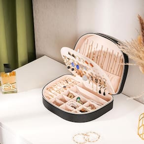ProCase Caixa de joias tamanho viagem, caixa de joias grande portátil em forma de concha, organizador de joias de 2 camadas em couro PU para mulheres - preta - O tamanho leve e compacto é fácil de colocar em sua bolsa, mala e bagagem, ideal para viagens e uso diário - A divisória da tampa superior inclui 8 ganchos para colar e 1 bolso elástico, pegboard para 32 pares de brincos; a divisória inferior inclui uma almofada de anel com 9 ranhuras; faça você mesmo a parte inferior direita para pulseiras, batom e pequenos acessórios com divisórias removíveis de ripa - Coberto com exterior de couro PU premium e interior de forro macio, protegendo as joias de arranhões, batidas, poeira e outros danos - Zíper resistente e suave que mantém suas joias seguras na caixa, fácil de abrir e fechar - Um doce presente para mulheres e meninas no Dia dos Namorados, Dia das Mães, aniversário de casamento, Natal, aniversário, etc.
