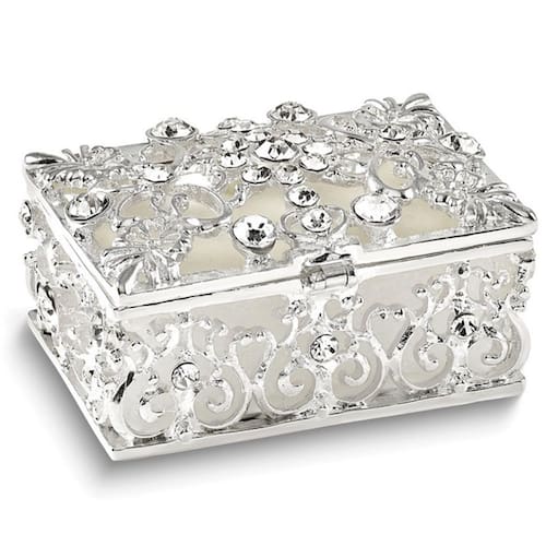 O presente perfeito para qualquer ocasião. Dê como presente no dia das mães, Natal, Dia dos Namorados, um aniversário. Uma ótima maneira de expressar seu amor a alguém importante em sua vida. - Design luxuoso: esta caixa de joias quadrada de prata é adornada com vários strass transparentes, adicionando um toque de elegância e sofisticação a qualquer penteadeira ou cômoda - Tamanho compacto: com dimensões de 6 x 6 x 13,5 cm e pesando apenas 300 g, esta caixa de bugigangas é pequena e leve, perfeita para armazenar suas joias favoritas sem ocupar muito espaço - Armazenamento seguro: o design da tampa articulada garante que suas joias permaneçam armazenadas com segurança dentro da caixa, enquanto os strass transparentes permitem que você veja facilmente sua coleção de relance - Uso versátil: não apenas para armazenamento de joias, esta caixa de bugigangas também pode ser usada para guardar pequenas lembranças, como anéis, brincos ou outros itens preciosos. Seu design versátil o torna uma adição prática e elegante a qualquer cômodo - Presente atencioso: seja para uma ocasião especial como um aniversário, aniversário ou Dia das Mães, ou simplesmente como um gesto de apreciação, esta caixa de joias quadrada de prata é um presente atencioso e elegante para qualquer mulher em sua vida