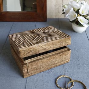 A Store Indya traz a você uma maneira de apreciar as pequenas coisas da sua vida com a caixa de armazenamento de madeira rústica. Habilmente feito à mão por artesãos indianos de Saharanpur. Possui um padrão exclusivo gravado na parte superior com detalhes impecáveis. Se você sempre quis ter sua própria caixa de armazenamento pessoal para manter seus objetos de valor, então esta é a melhor para você. Esta caixa de madeira é uma combinação de criatividade e força, pois é feita de madeira natural e altamente durável. De bugigangas, brincos, anéis a relíquias, você pode armazenar tudo o que quiser nesta caixa multiuso. Ele vem com uma tampa de encaixe firme que garante que nenhum item armazenado caia. Se for o aniversário da sua namorada ou esposa, então você pode colecionar lindas bugigangas nesta caixa e surpreendê-la, ela definitivamente vai adorar!