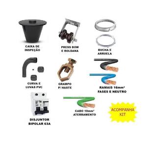 Especificações técnicas para caixa de luz TAF 01 Caixa para medidor 520x260x170mm; 01 Disjuntor bipolar 63A; Cabo flexível 750V 16mm 2 lances de 6 metros Fase Pretos, 1 lance 6 metros Neutro Azul e 1 lance 1,5 metros Terra Verde e terminais tipos ilhós e argola 16mm; Caixa de Inspeção Cônica Preta Press Bow e Roldana Bucha e Arruela Curva e Luvas PVC Grampo para Haste Aterramento