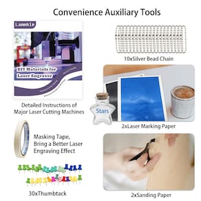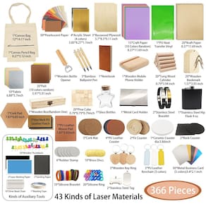 Caixa de material de gravação de 366 peças: materiais DIY para todos os gravadores a laser com instruções - 43 tipos de suprimentos de gravação a laser, incluindo tecido, metal, madeira, acrílico, borracha, couro PU - Kit de material de gravação a laser: esta caixa de material de gravação é fornecida com 366 peças de materiais de teste de gravação a laser, que são feitos de 11 materiais, incluindo papel, metal, borracha, vidro, pedra, madeira, fita adesiva, couro, acrílico, cerâmica, feltro - Manual dedicado: as instruções fornecem parâmetros de processamento recomendados detalhados para cada acessório de gravação a laser, controle mais preciso de tempo e potência, ajudando você a obter rapidamente o efeito de gravação desejado - Qualidade estável: todo material de corte a laser passou por um rígido controle de qualidade para atender às suas diferentes necessidades - DIY Fun: é feito para iniciantes em gravação a laser. Você pode criar seu trabalho personalizado, como um presente especial para sua família e amigos para comemorar seu relacionamento - Operação simples: incluímos papel preto de marcação a laser para aprimorar o efeito laser em itens de pedra, aço inoxidável e acrílico. E a fita adesiva está incluída para melhorar o efeito do laser em itens de couro e madeira