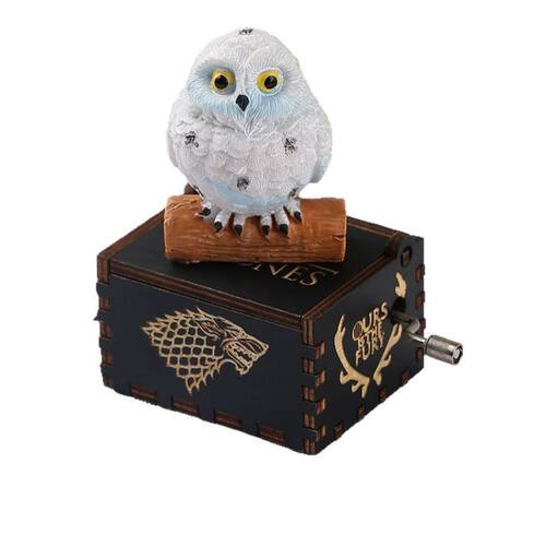 Material: Tampo de escultura de coruja exclusivo em madeira — apresenta uma estatueta de coruja branca finamente detalhada empoleirada em um galho de madeira sintética, adicionando personalidade e charme ao design geral. Estética escura de inspiração vintage — A caixa de madeira preta é acentuada com emblema de lobo gravado a laser e motivos de chifre, dando-lhe uma aparência misteriosa e ousada. Mecanismo manual de música com manivela — basta girar a alavanca para desfrutar de uma melodia mecânica, sem necessidade de baterias, perfeito para uma experiência musical retrô. Construção durável em madeira — Fabricada com materiais de madeira resistentes com cantos cortados com precisão e montagem sólida para uso duradouro em mesa. Ótima para exibir ou presentear — uma caixa de música estilosa adequada para prateleiras, desktops ou como uma lembrança atenciosa para estudantes, colecionadores ou fãs de fantasia.