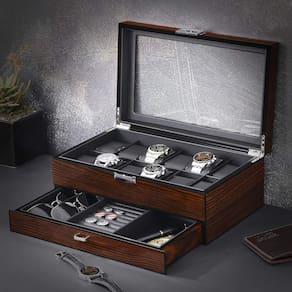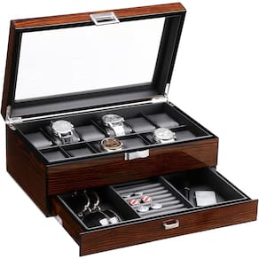 Você precisa de organização para uso do espaço em uma casa com espaço muito limitado. Esta caixa de relógio BEWISHOME com bandeja de joias ajudará você. O design de gaveta dupla pode armazenar outros itens soltos, como elos de relógio, acessórios de relógio, acessórios de carteira e outras coisas que você gosta de trocar diariamente. Alto nível de artesanato, detalhes e funcionalidade, dobradiças guiadas extremamente resistentes e grande janela de visualização, aparência moderna sem parecer futurista e elegante sem ser ostensiva. Fica bem onde quer que você o coloque. Especificações: - Material: placa de fibra de densidade média (MDF), forro de couro sintético - Janela: vidro real - Cor: Caixa de relógio marrom, travesseiros pretos - Dimensões do produto (C x L x A): 13,19" x 8,07" x 5,12" (33,5 x 20,5 x 13 cm) - Janela de vidro: 11,18" x 6,14" (28,4 x 15,6 cm) - Tamanho do compartimento do relógio: 1,97" x 3,54" (5 x 9 cm) - Tamanho do segundo nível: 28.9 cm x 17.4 cm x 4.0 cm (28.9 x 17.4 x 4 cm) - Peso líquido: 3,7 kg Conteúdo da embalagem: - 1 caixa de relógio. - 12 almofadas removíveis. Serviço 100% satisfatório e garantia: Prometemos oferecer 100% de satisfação aos nossos clientes. Se você não estiver satisfeito com sua compra por qualquer motivo, , resolveremos o problema até que você esteja satisfeito. Vamos substituí-lo ou reembolsar seu dinheiro, sua escolha! - Design atraente e artesanato de alta qualidade: o organizador de relógios é feito de MDF, o interior é coberto com couro sintético ultra suave, destaca a beleza única enquanto protege os relógios de arranhões. Cria um único local para todas as joias e você pode facilmente decidir qual deseja usar antes de sair - Capa combo de relógios e joias: design de camada dupla. A primeira camada oferece 12 compartimentos de relógio, tem espaço suficiente para guardar relógios grandes. Quanto à gaveta de puxar, os espaços na lateral são grandes o suficiente para guardar pulseiras extras, brincos, abotoaduras, correntes ou qualquer outra joia pequena. A seção estriada no meio é útil para anéis menores, abotoaduras e joias semelhantes - Tampa grande de vidro real: esta caixa de exibição de relógio tem uma parte superior transparente, você terá uma visão ampla para encontrar seu tesouro mais favorável em segundo, ter tampa de vidro é uma grande vantagem. Se seus relógios são Eco Drives! A luz é capaz de passar e carregar os relógios para evitar que os relógios fiquem empoeirados - Almofadas de alta qualidade: feitas de couro sintético de alta qualidade e almofadas de esponja, indeformáveis e macias, protegendo seus relógios de poeira, umidade e agitação perfeitamente. As almofadas de relógio são dimensionadas para caber perfeitamente nos compartimentos, podem guardar relógios grandes facilmente, servem para pulseiras femininas menores também, evitando esmagar os travesseiros. O tamanho de cada compartimento de relógio é: 9,5 cm C x 4,97 cm L - Ótimo presente com caixa de presente elegante: a caixa de armazenamento do relógio é embalada em uma caixa de presente de luxo. Este é um presente incrível para homens que possuem joias incríveis e precisam mantê-las organizadas. Você pode usar o suporte de relógio como presente para qualquer ocasião, fica maravilhoso combinando com seu camarim