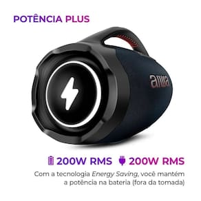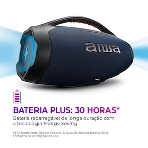 200W RMS DE POTÊNCIA Sinta a experiência sonora impactante com os 200W RMS de potência da caixa portátil AIWA. Você será levado pela música com graves mais profundos e som potente. E, com a tecnologia Energy Saving, você mantém os 200W de potência até ouvindo música na bateria (fora da tomada).