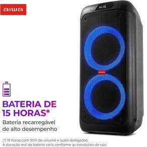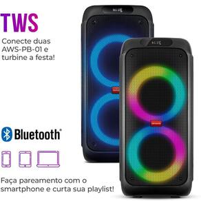 Caixa de Som Aiwa Partybox PB-01 Bluetooth 15H USB 200w RMSCom a PartyBox AWS-PB-01, você pode levar sua festa a qualquer lugar. E o melhor: com uma experiência sonora incrível! Com assinatura AIWA e sistema de som Superbass, que conta com 200W RMS de potência, o item proporciona vocais claros e graves potentes. Desenvolvida com design moderno, a PartyBox também é portátil e possui alça fixa e rodinhas para transporte. Saiba mais sobre a AWS-PB-01 da AIWA:SUPERBASS: 200W RMS O sistema de som Superbass conta com 200W RMS de potência e duas vias, 2 Woofers de 8’’ e 1 Tweeter. É garantia de uma experiência sonora incrível, com vocais claros e graves potentes. Sinta a força da batida de um AIWA!LED COLOR LIGHT: São 6 modos de luzes dinâmicas com efeito Multicolors, que transformam qualquer ambiente em uma balada!15 HORAS DE BATERIA: A música não pode parar! A bateria possui duração de até 15 horas, variando de acordo com as condições de uso.FUNÇÃO TWS: DUPLIQUE SUA EXPERIÊNCIA: Amplie o som da sua festa com a função TWS (True Wireless Sound). Basta conectar duas PartyBox AIWA AWS-PB-01 para sincronizar músicas e luzes e duplicar o som.BLUETOOTH: Faça o pareamento com seu smartphone via Bluetooth e curta suas playlists favoritas! Conexão mais rápida e estável com a versão 5.0 do Bluetooth.MÚLTIPLAS CONEXÕES: USB, AUX E Mais: A PartyBox possui entradas USB e AUX, além de duas entradas para microfone e uma para instrumentos. Você pode fazer seu próprio show!LEVE PARA QUALQUER LUGAR: Com alça fixa e rodas, a AWS-PB-01 é portátil e superfácil de transportar para qualquer lugar.Especificações:- Marca: Aiwa- Modelo: Partybox PB-01- Voltagem: Bivolt- Código ANATEL: 14231-21-04646Duração da bateria:- Volume 50% - Luzes ligadas – Até 6 horas- Volume 50% - Luzes desligadas- Até 15 horas- Volume 100% - Luzes ligadas – Até 3 horas- Volume 100% - Luzes desligadas –Até 6 horas- Tamanho do cabo: 60cm- Distância de conexão Bluetooth: Até 10m- Carregamento Cabo: Entrada AC (127-220VAC 50/60Hz)- TWS: Sim - Conecte 2 caixas de som Partybox Aiwa em sincronia- Modos de luz: 7 modos de luz- Tweeter: 1,3”- Bateria: lítio- Rodas para transporte: Sim- Entradas: 1 USB | 1 Auxiliar.in (P2) | 1 Guitar.in (P10) | 2 Microfone.in (P10)- Bluetooth: 5.0- Potência da saída RMS: 200 W RMS- Capacidade da bateria: 14.8v, 4000 mAhDimensões e peso:- Altura: 70,4cm- Largura: 32,8cm- Profundidade: 32,9cm- Peso: 10,7kgItens inclusos:- Partybox Aiwa- Cabo de carregamento- Cabo de áudio (P2-P2)- Manual de instruçõesGarantia: 12 meses do Fabricante
