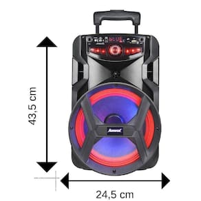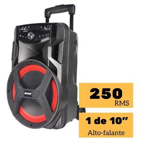 Tem Woofer de 10 polegadas (com LED), tweeter de 4 polegadas, que aumenta a qualidade de som.