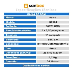 A caixa de som amplificada bluetooth portátil preta pulse sp504- 600w rms oferece um som de extrema qualidade e potência com a pulsebox sp504 é impossível de ficar parado, faça muito barulho e anime suas festas com os leds decorativos presentes na caixa de som. Recheado de funcionalidades essa caixa de som oferece conexões e tecnologias como bluetooth, tws, mas você também pode reproduzir músicas através de entradas físicas, como pen drive, usb ou até mesmo cartão de memória. Além disso, ela também tem entrada aux e duas entradas p10 para a conexão de microfone e instrumentos musicais. Totalmente versátil essa caixa possui tecnologia como o tws, que permite conectar duas caixas pulsebox sp504 sem a necessidade de fios, com isso, você dobrar a potência e criar uma imersão maior ao escutar suas músicas favoritas. Seu design é elegante e minimalista o display e as principais funções da caixa estão localizados na parte superior para proporcionar mais conforto e praticidade na hora de acessar as funções. Essa caixa de som é equipada com incrível show de led no painel frontal ao redor dos altos falantes. Além disso, ela conta com alças para facilitar o transporte e dutos de ar para melhorar a acústica. São 600w rms de pura potência a sp 504 é equipada com dois woofers de 6,5 polegadas e um tweeter de 1 polegadas. Além disso, ela possui uma bateria interna recarregável com até 4 horas de autonomia, essa bateria leva 3 horas para recarga completa. Use-o onde quiser, este dispositivo é projetado para você ter sempre a melhor experiência sonora, com garantia de qualidade pulse. Especificações -marca: pulse -modelo: sp504 -gtin/ ean: 7908414443143 -cor: preto -design: portátil -sistema de iluminação: leds decorativos -display: led -potência: 600w rms -alto-falante: 2 woofer 6,5 polegadas -tweeter: 1 polegada -com bateria interna: sim, bateria recarregável -capacidade da bateria: 1500 mah -autonomia da bateria: 3 - 4 horas -tempo de recarrega: 3 horas -frequência de resposta: 20hz - 18khz -impedância: 4 ohms -sensibilidade: 85db + - 3db -função bluetooth: sim -versão do bluetooth: 5.0 -alcance do bluetooth: 10m -função tws: sim -função microfone prioridade: não -função troca pasta: não -função karaokê: sim -controle de eco: sim -controle de graves e agudos: não -função gravar rec. : não -rádio: não aplica -controle remoto: não -conexões entradas : bt/ tws / usb / sd / aux / 2x p10-entrada aux: p2 3,5mm -alça de transporte: sim -entrada para pedestal: nâo -voltagem: bivolt automático -anatel/inmetro: 15297-21-03111 -dimensões l x a x c : 25 x 59 x 23cm -peso: 6 kg -peso bruto: 6,7 kg Itens inclusos -01 caixa de som pulse sp504 -01 fonte de alimentação -01 manual Garantia -garantia de fábrica: 36 meses