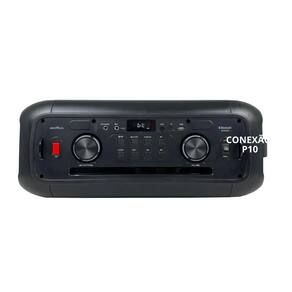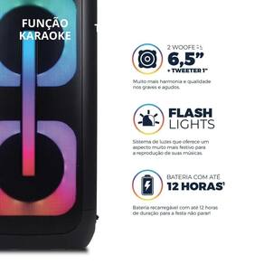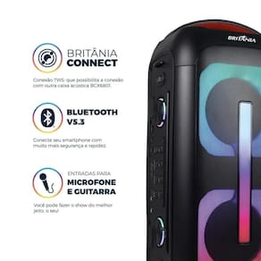 Atributos e Benefícios: - 650W de potência: som mais forte para festas - Flash Lights (LED): efeitos de luz para ambientação - Bateria interna até 12h: mais autonomia sem tomada - Bluetooth 5.3: conexão sem fio mais estável - Entradas USB / P2 (AUX) / P10 (Mic e Guitarra) - Britânia Connect: conectividade entre duas BCX6801 - Equalização analógica (Bass/Treble) e reforço de graves (Power Bass) - Alça para transporte + controle remoto: mais praticidade