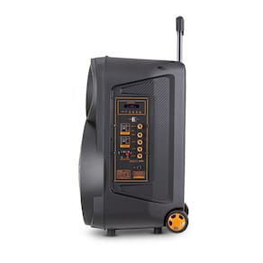 Especificações • 600W de potência • Bivolt • Alto-falante de 12” • Entrada para Microfone P10 • Entrada USB • Entrada SD Card • Bluetooth • Bateria interna recarregável • Painel lateral • Alça e rodinhas para transporte • Garantia: 12 meses de fábrica • Dimensões (AxLxP): 53,5x33x34,5 cm • Peso: 5kg