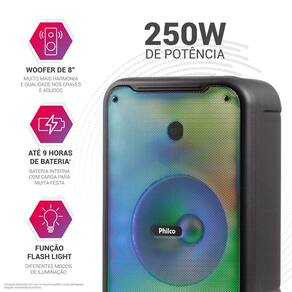 A Caixa de Som Amplificada Philco Flash Lights 250W PCX3800 é a união de potência e qualidade sonora. Com 250W de potência, ela proporciona uma experiência auditiva imersiva, onde é possível sentir cada batida.