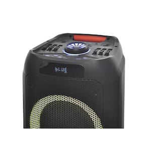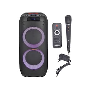 Especificações Técnicas • 2 Alto-falantes de 8" • POTÊNCIA 1000 W RMS • 1 Tweeter • Antena interna • Bateria interna 3,7V 1800mah x2 Lithium recarregável • Autonomia da bateria: 2 à 3 horas de acordo com o volume do aúdio utilizado • Bluetooth 5.0 • Entrada auxiliar para microfone ou guitarra • Função gravação e repetir • USB • Leitor de cartão • Iluminação frontal LED • Rádio FM • Frequência de resposta 55Hz-20KHz (+/-3DB) • Impedância 4 Ohms • Sensibilidade 85dB