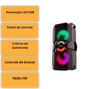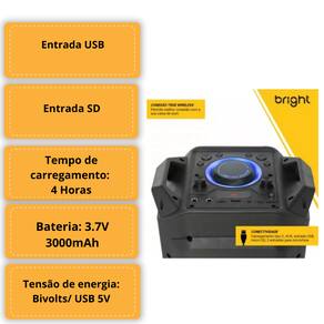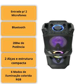 Seu alcance é de 10 m, som estéreo, conectividade Bluetooth 5.0, USB e Micro SD, duas entradas entrada P2, potência de 200W e tem bateria com capacidade de3000 mAh.