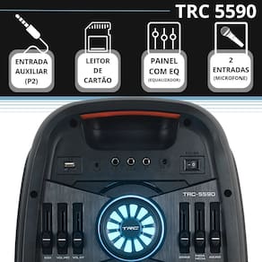 A Caixa de Som Amplificada TRC 5590 é uma caixa para quem gosta de qualidade de som ao EXTREMO, design e potência. Para quem gosta de graves perfeitos a TRC 5590 possui 02 subwoofers de 08 polegadas cada que dão toda qualidade para os graves, além de graves macios e vibrantes. Quer fazer um Karaokê divertidíssimo? A TRC 5590 possui 02 entradas para Microfone que você pode conectar e soltar a voz e animar suas festas. Com bateria de longa duração, você poderá levar sua TRC 5590 a qualquer lugar sem preocupar com uma tomada próxima, com uma bateria de 05 horas médias de duração. A TRC 5590 possui conexão Bluetooth, entrada para Pendrive, Cartão SD e Auxiliar. Faça Festas para um ambiente com até 100 pessoas e chame a atenção com sua TRC 5590!