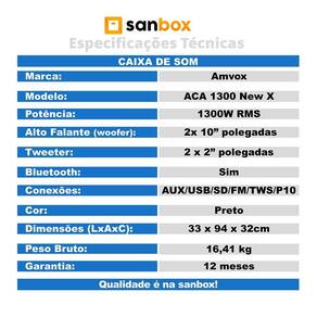 São 1300W RMS de pura potência. A NEW X é equipada com dois Woofer de 10” polegadas e dois Tweeter turbinado de 2” polegadas. Essa caixa de som não possui bateria interna e funciona sendo alimentada por energia elétrica. Bivolt automático.