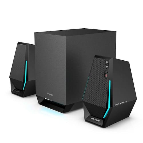 - Potência de saída: 30W RMS (7,5 W + 7,5 W + 15 W) - Conexões: Bluetooth 5.3 / USB Tipo-C / 3,5 mm - Codecs de áudio: SBC - Driver Full-range Satélites: 2,5`` - Resposta de frequência: 60Hz-20kHz - Relação sinal-ruído: (SNR) 80dB - Nível de ruído: =25dB(A) - Modos de equalização: Jogo / Música / Filme - Iluminação: RGB - Alimentação: Bivolt