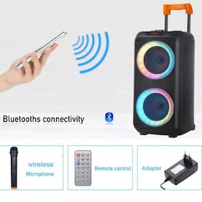 Conta ainda com entrada USB, auxiliar P2, cartão de memória, rádio FM e microfone, além de controle remoto para facilitar o uso à distância. A bateria recarregável proporciona horas de reprodução sem depender de tomadas.