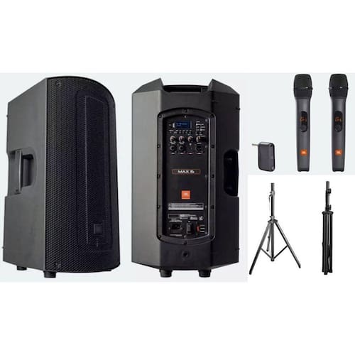 Kit composto de 2pçs Caixas de Som JBL Max 15 Ativa Bluetooth 110/220V + 2 Microfones JBL MICBR2 de mão sem fio.+ 2 tripés 1,80m