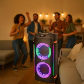 A versatilidade impressiona: controle remoto, 2 microfones inclusos para karaokê, múltiplas entradas como USB, P10, TF Card e P2. O Bluetooth V5.4 garante conexão instantânea com seus dispositivos. A função Flash Light com diferentes modos de iluminação transforma seu evento em um espetáculo visual e sonoro.