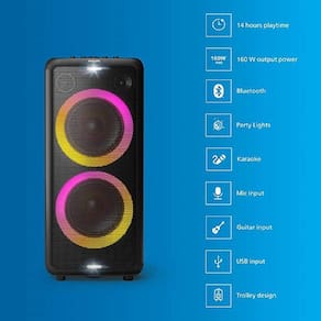 Descrição do produto:Aumente o volumeAgite a festa com esta incrível caixa de som extragrande som poderoso, graves potentes e luzes coloridas enchem o ambiente com boas vibrações. Você pode conectar uma guitarra e um microfone à caixa de som: o design de carrinho facilita a movimentação.Aumente o volumeLuz da caixa de som e estroboEntradas para microfone e guitarraFunções especiais de karaokêSom potente. Extragrave. 14 horas de reproduçãoEfeitos de luz para festas. Brilhe com a músicaColoque todo mundo para dançar com os efeitos de luz para festas um anel de luzes coloridas da caixa de som pulsam no ritmo da música e há quatro diferentes modos de iluminação para escolher. Seja qual for seu tipo de balada, esta caixa de som tem tudo o que você precisa.Entradas para microfone e guitarra. Efeitos de karaokêUma entrada de microfone 6,3 mm vai agitar sua festa. Há também uma entrada de guitarra, para que você arrase no vocal enquanto faz um solo tanto a guitarra quanto o microfone têm os próprios controles de volume na caixa de som. Você pode mudar sua voz, apagar vocais e também pode adicionar efeitos de eco.Especificações técnicas:Som:- potência de saída máx : 160 w- potência de saída rms : 80w- distorção harmônica total: =10%- resposta em frequência: 40 hz - 20 khz, -12 db- recursos de áudio: karaokê, controle de agudos e gravesCaixas acústicas:- número de canais de som: 2- configuração do driver: bidirecional- número de tweeters: 2- diâmetro do tweeter: 2,5- número de woofers: 2- diâmetro do woofer: 8Conectividade:- entrada para microfone: 1 x 6,3 mm com controle de volume - entrada de guitarra: 1 x 6,3 mm com controle de volume - usb: sim reprodução, carregamento e leitura, serviço - entrada de áudio: 1 entrada de linha de 3,5 mm- saída de áudio: 1 saída de linha de 3,5 mm- versão do bluetooth: 5,0- alcance do bluetooth: 10 m espaço livre - perfis bluetooth: formato de streaming: sbc, transmissão de músicas a2dp , controle de reprodução/volume: avrcp, suporte a multiponto multipair - padrão dlna: não- conexão com múltiplos alto-falantes: não- casa inteligente: nenhumFormatos de áudio compatíveis:- bluetooth: sbc- usb: mp3, wav, wma, flacConforto:- controle de volume: interruptor táctil- karaokê: controle de eco, volume de mic, atenuante vocal, trocador de voz- controle da guitarra: sim- tela: led- efeito de luz: sim, efeito de luz do alto-falante, luz estroboscópicaLig/desl:- fonte de alimentação: 100-240 vac, 50/60 hz- capacidade da bateria: 4400 mah, 7,4 v- duração da bateria: 14hs- tempo de carregamento: 3hs- tipo da bateria: íon de lítio integrado - power bank: sim, integrado 5v/1a Visor:- luz fundo: azul- indicador de carga: vermelhoCompatibilidade:- controle por aplicativos de smartphone/tablet: nãoAcessórios inclusos:- cabo de energia ca- guia de início rápido- certificado de garantia- folha de garantia de segurançaDimensões do produto:- profundidade: 32,2cm- altura: 70cm- peso: 10,52kg- largura: 30,9cmHomologação anatel: 087902110947