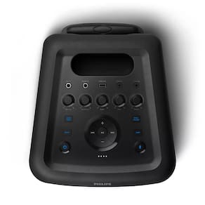 O design de carrinho com a alça de transporte e a bateria integradas permitem que você toque essa caixa de som onde quiser. Coloque todo mundo para dançar com os efeitos de luz para festas! Um anel de luzes coloridas da caixa de som pulsam no ritmo da música e há quatro diferentes modos de iluminação para escolher. Seja qual for seu tipo de balada, esta caixa de som tem tudo o que você precisa.