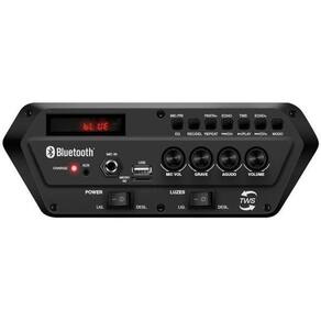 Display digital- Bluetooth tecnologia sem fio- Rádio FM Equalizador- Bateria interna recarregável- Luzes LED Potência.: 400W Com Bluetooh.: Sim Entrada USB.: Sim Entrada cartão de memória.: Sim Com sintonizador Fm.: Sim Bateria.: Interna recarregáve lTensão/Voltagem.: bivolt Garantia.: 12 meses
