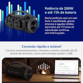 A Caixa de Som Portátil Philips Boombeat TAX400B/78 tem potência de 200W RMS, resistência IP66 e conexão Bluetooth 5.3 para você levar música com qualidade a qualquer lugar.