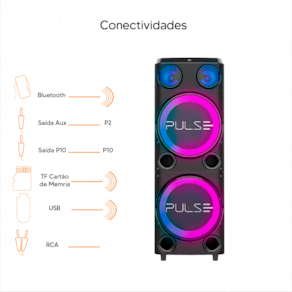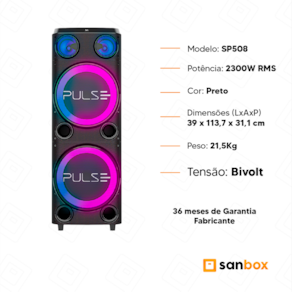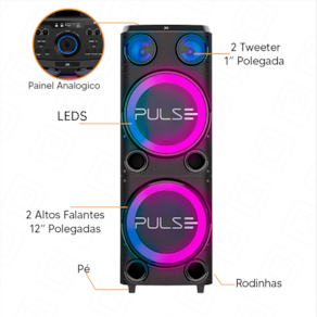 Especificações Técnicas: -Marca: Pulse -Modelo: SP508 -GTIN/ EAN: 7908414490130 -Anatel: 081992203111 -Cor: Preto -Design: Portátil -Sistema de Iluminação: LED -Potência: 2300W RMS -Alto Falante: 2 Woofer de 12” polegadas -Função TWS: Sim -Função Bluetooth: Sim, 5.0 -Alcance do Bluetooth: 10m -Função Microfone Prioridade: Não -Controle de EQ/ECHO: Sim -Rádio: Não -Conexões (Entradas): BT / USB / AUX / RCA/ TWS / 2xP10 -Entrada AUX: P2 -Alça de transporte e Rodinhas: Rodinhas -Tensão: Bivolt -Controle Remoto: Não -Suporte para Pedestal/Tripé: Não -Dimensões (L x A x C): 39 x 113,7 x 31,1 cm -Peso: 21,5kg -Peso Bruto: 21,5kg