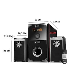 Dimensões aproximadas do produto (A x L x P): 1 Subwoofer: 31 x 17 x 32 cm 2 caixas de som auxiliares: 20 x 10,5 x 11,2 cm