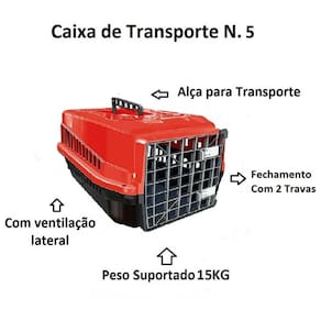 Especificações: - Produzida totalmente em plástico polipropileno com alta durabilidade - A Caixa de Transporte para Cães e Gatos é excelente para transportar seu Cão ou Gato com segurança e conforto durante viagens ou consultas ao veterinário - Fixação da tampa superior com a base por parafuso inox, sendo sua montagem muito fácil - Higiênica: pode ser lavada - Com ventilação lateral - Apto para viagens de avião - Tem alça reforçada, porta com trava de segurança. - Peso suportado de até 15Kg - Cor: Vermelho - Caixa de transporte tamanho N5