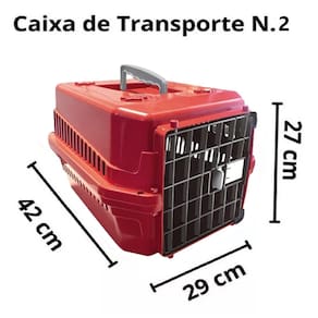 Especificações: - Produzida totalmente em plástico polipropileno injetado com alta durabilidade - A Caixa de Transporte para Cães e Gatos é excelente para transportar seu Cão ou Gato com segurança e conforto durante viagens ou consultas ao veterinário - Fixação da tampa superior com a base por parafuso inox, sendo sua montagem muito fácil - Higiênica: pode ser lavada - Com ventilação lateral - Apto para viagens de avião - Peso suportado de até 5Kg - Cor: Vermelho - Caixa de transporte tamanho N2