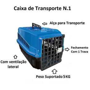 Especificações: - Produzida totalmente em plástico polipropileno com alta durabilidade - Fixação da tampa superior com a base por parafuso inox, sendo sua montagem muito fácil - Higiênica: pode ser lavada - Com ventilação lateral - Apto para viagens de avião - Peso suportado de até 5Kg - Cor: Azul - Caixa de transporte tamanho N1