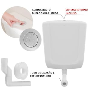 Caixa de descarga baixa branca com duplo acionamento + conversor de descarga Caixa de descarga baixa com duplo acionamento astra A caixa de descarga baixa com duplo acionamento astra é um dispositivo sanitário de alta qualidade, projetado para oferecer maior eficiência e economia no consumo de água. Este modelo possui um design moderno e elegante, adequado para todos os tipos de banheiros, sejam eles residenciais, comerciais ou públicos. Especificações técnicas Material: polipropileno Manual: sim Capacidade: 6l Dimensões do produto: 38 x 12 x 47cm do fabricante: 90 dias Cor: branco Acabamento: brilhante Compatibilidade marca da cerâmica: - belize - atlantis - celite - azálea, acesso plus, aloha, versato, life, city, riviera, smart, clássica, sig bergamin - deca - aspen, conforto, monte carlo, village, plus, nuova, studio, quadra, - - duna, windsor, oxford, fast, ritz, Spot, wish. - onix - onix. - fiori - alpinia, flox, lavanda infantil. - hervy - colonial, laguna. - icasa - diamantina, sabatini, luna medic, luna, firenze, etna. - incepa - flamingo, thema, calypso, acesso plus, eros, calypso plus, bali, thema plus, - - - boss, avant plus, incepa kids, suite. - logasa - angra. - luzarte estrela - porto, estoril. - roca - meridian, victoria/laura, nexo, happening, dama senso, hall. - santa marina - liberty, valentina. - mga-agnes t - champion. - santa clara - dona beja. Conversor válvula descarga para caixa acoplada baixa astra Um conversor válvula descarga para caixa acoplada baixa astra é um dispositivo projetado para converter uma válvula de descarga tradicional em uma caixa acoplada baixa. O conversor é composto por duas partes principais: uma placa adaptadora e uma válvula de entrada. A placa adaptadora é instalada no lugar da válvula de descarga existente, utilizando os mesmos furos de fixação. A válvula de entrada é conectada à placa adaptadora e funciona como o mecanismo de descarga da caixa acoplada baixa. Ao instalar o conversor, a água é liberada da caixa acoplada para o vaso sanitário através da válvula de entrada, em vez de uma válvula de descarga tradicional. Isso oferece várias vantagens em relação a uma válvula de descarga, incluindo economia de água e espaço. Além disso, o conversor é fácil de instalar e pode ser em praticamente qualquer banheiro que tenha uma válvula de descarga. Ele é projetado para ser compatível com a maioria das marcas e modelos de vasos sanitários e pode ser uma solução conveniente e econômica para a atualização de banheiros antigos. Especificações técnicas Material: abs, poliacetal, silicone Dimensão do produto: 5,0 x 5,5 x 7,5cm Cor: branco Acabamento: brilhante do fabricante: 90 dias O kit segue com todos os itens para montagem e pronto para uso após a instalação A se aplica a todo e qualquer vício ou defeito aparente ou que não estejam em conformidade com o produto. - 90 dias para a caixa de descar baixa - 90 dias para o conversor de descarga Itens inclusos 01 caixa de descarga baixa 01 conjunto de mecanismos de acionamento duplo 01 espude 01 tubo de ligação 01 régua suporte 01 de vazão 02 buchas s6 02 parafusos 3 x 30mm 01 acabamento branco 01 tubo extensor 01 adaptador 01 vedante 01 porca