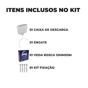 Caixa de descarga elevada de 6,8 à 9l branca + engate + fita veda rosca Caixa de descarga elevada de 6,8 à 9l branca astra A caixa de descarga elevada astra é um sistema de descarga de água utilizado em banheiros que é instalado na parede acima do vaso sanitário. Essa caixa é conhecida por ser uma solução eficiente para a economia de água, uma vez que permite controlar a quantidade de água liberada a cada descarga. A caixa de descarga é produzida em materiais resistentes e duráveis, o que garante sua longa vida útil. Sua instalação é fácil e acompanha um kit de fixação, que permite a colocação do produto de forma segura e prática. Uma das vantagens é que ela pode ser utilizada em conjunto com vasos sanitários de diferentes modelos e tamanhos. Isso faz com que ela seja uma opção versátil para diferentes tipos de banheiros, sejam eles residenciais ou comerciais. Além disso, a caixa de descarga elevada astra possui um design moderno e elegante, que contribui para a decoração do banheiro. No geral, a caixa de descarga elevada astra é uma solução prática e eficiente para quem busca economizar água e ter um banheiro mais moderno e funcional. Especificações técnicas Material: pvc Pressão de trabalho: 2 - 40mca Manual: sim Capacidade: 6,8 - 9l Dimensões do produto: 37,08 x 33,86 x 13,7cm Compatibilidade: bacias 6 lps e mais antigas Cor: branco Acabamento: brilhante do fabricante: 90 dias Engate mangueira flexível para descarga 40cm x 1/2 branco astra Um engate flexível para descarga é um dispositivo para conectar um cano de esgoto ou uma mangueira de descarga a uma fonte de escoamento, como uma pia, banheira ou vaso sanitário. Ele é projetado para ser flexível, permitindo que ele se dobre e se mova sem quebrar ou vazar. O engate flexível é uma alternativa conveniente e eficaz aos tubos de esgoto rígidos, especialmente em situações onde a instalação de um cano rígido não é viável devido à falta de espaço ou à dificuldade de manobra. Além disso, o engate flexível pode ser facilmente removido e substituído, o que o torna uma opção popular para instalações temporárias ou em reformas de banheiros e cozinhas. Especificações técnicas Material: pvc flexível Temperatura indicada: somente água fria Pressão: 40 m.C.A Diâmetro: 1/2 Tipo de corpo: macho-fêmea e fêmea-fêmea Cor: branco Acabamento: brilhante do fabricante: 90 dias Fita veda rosca teflon 12mm x 5m firlon A fita veda rosca teflon firlon é produzida pela plastifluor que líder de produção para o mercado brasileiro. Produto com excelência em qualidade, supera a norma abnt nbr 16368:2015. Especificações técnica Composição química: ptfe poli-tetra-fluor-etileno . Aplicação: vedação de roscas e conexões em tubulações de água fria, água quente, vapor, combustíveis, fluidos e gases em geral. Temperatura de trabalho: de - 90c até +240c. Resistência química: material de baixíssima reatividade química, resistente aos líquidos e gases comumente utilizados em instalações industriais como: ácidos, bases, solventes, combustíveis, lubrificantes, vapor, gases de processo etc. Compatibilidade com oxigênio: compatível com oxigênio líquido ou gasoso em temperatura ambiente e criogênicas. Consultar quanto ao uso acima de 50c. Tolerâncias dimensionais: sempre maior ou igual que a espessura e densidade mínima. O kit segue com todos os itens para montagem e pronto para uso após a instalação A se aplica a todo e qualquer vício ou defeito aparente ou que não estejam em conformidade com o produto. - 90 dias para a caixa elevada - 90 dias para o engate Itens inclusos 01 caixa de descarga elevada 01 engate 01 rolo de fita veda rosca 12mm x 5m 01 régua suporte 01 de vazão 02 niples 02 buchas s6 02 parafusos 3 x 30mm
