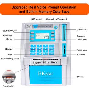 Características: O caixa eletrônico infantil ajuda as crianças a gerenciar seu dinheiro com sua exibição realista. Funciona como um caixa eletrônico real, insira o cartão e insira um código secreto de 4 dígitos para acessar suas economias. Possui um despertador em tempo real com calendário e alimentador motorizado de notas. A máquina acende e emite sons reais de caixa eletrônico. Relógio com formato de 12/24 horas e alarme. Definição de meta de economia. Retirada e verificação de saldo. Requer 3 pilhas AA (não incluídas). Especificações: Material: ABS Cor: prata e preto Tamanho: 187 x 148 x 240 mm Conteúdo da embalagem: 1 caixa econômica. 1 manual do utilizador (idioma português não garantido). 1 cartão ATM pessoal. Tipo de unidade: peça Peso da embalagem: 1,13 kg. Tamanho do pacote: 25 cm x 20 cm x 15 cm (9,84 pol x 7,87 pol x 5,91 pol.) - ?🎁 ????? ?? -- Cada função, cada processo de operação tem instruções de voz em inglês, voz humana, instruções completas, o que aumenta a diversão interativa e torna a operação mais conveniente. Você pode ajustar o volume para silenciar quando não precisar de voz. - Você pode economizar equilíbrio, alvo, despertador, informações de dados, mesmo que a bateria esteja sem energia, e esses dados serão restaurados quando uma nova bateria for inserida. A senha não é salva, portanto, pode ser redefinida redefinindo quando a senha for esquecida. - O código PIN torna sua 'propriedade' mais segura, fácil de alterar o código para outra. Se você esquecer sua senha, pressione o botão RESET, o código retornará ao 0000. Brinquedo perfeito para ensinar ao seu filho ou menina o valor do dinheiro de uma maneira divertida, tornando este banco de dinheiro um ótimo brinquedo educativo. - ?🎁? ?-- O cofrinho ATM pode sugar automaticamente o papel-moeda, tornando mais fácil para as crianças economizarem sua mesada ou ganhos. Ele também pode ler cada moeda, exibir o que as moedas foram depositadas e adicioná-las ao seu saldo, tornando-as uma ótima solução de economia tudo-em-um. Este recurso torna mais fácil para as crianças economizarem dinheiro e aproveitarem o processo de fazê-lo. - ?🎁? ?--Você pode definir as quantias-alvo de dinheiro para economizar, atingir até 9999,99. As crianças podem saber os valores que ainda são necessários para alcançar seu objetivo. As crianças podem definir a meta para os presentes que desejam e testemunhar que a realização gradual do alvo é a maior felicidade da criança.