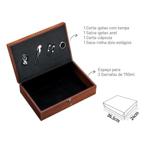 Ficha Técnica: País: Brasil Produtor: Boccati Utilidades Tipo: Acessórios para Vinho Dimensões: 24x36,5x11cm (CxLxA) Peso: 1200g Material: Madeira MDF (caixa) | Metal e PP (acessórios) Cor: Madeira (caixa) | Metal (acessórios)