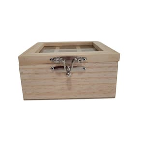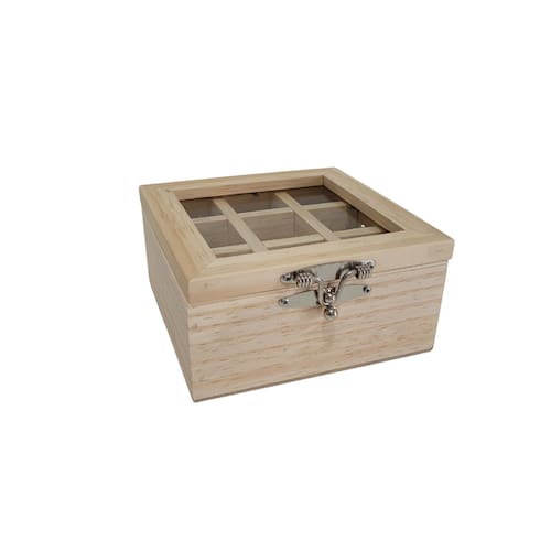 Caixa para chá com 9 espaços, com vidro na tampa, com fecho e dobradiça - em pinus